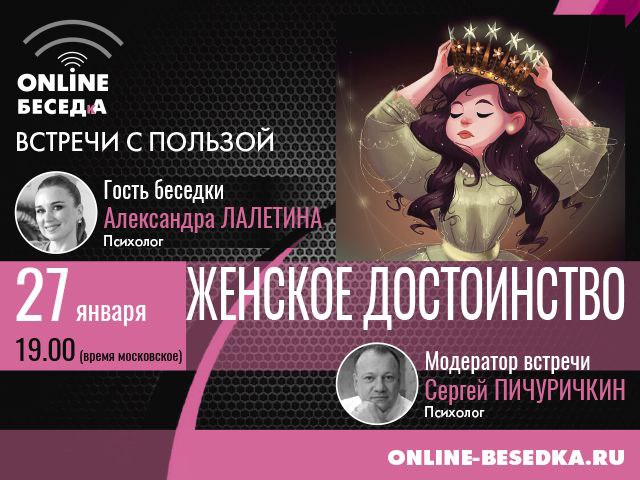 Встречаемся в ONLINE-БЕСЕДКЕ 27 января в 19.00 МСК. Тема беседы: ЖЕНСКОЕ ДОСТОИНСТВО. Если опоздаете, вам будет предоставлен доступ к записи. Регистрация и подробности тут.
